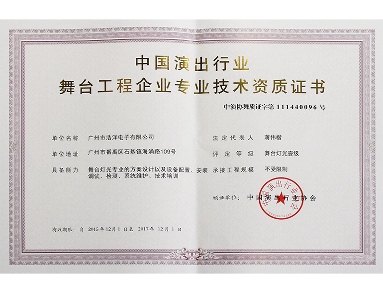 中國演出行業(yè)舞臺(tái)工程企業(yè)技術(shù)資質(zhì)證書(舞臺(tái)燈光壹級)