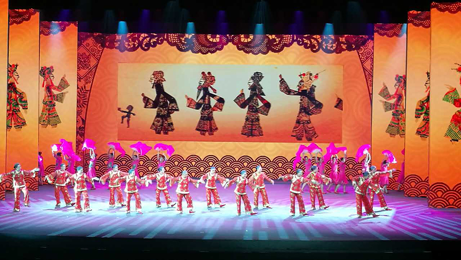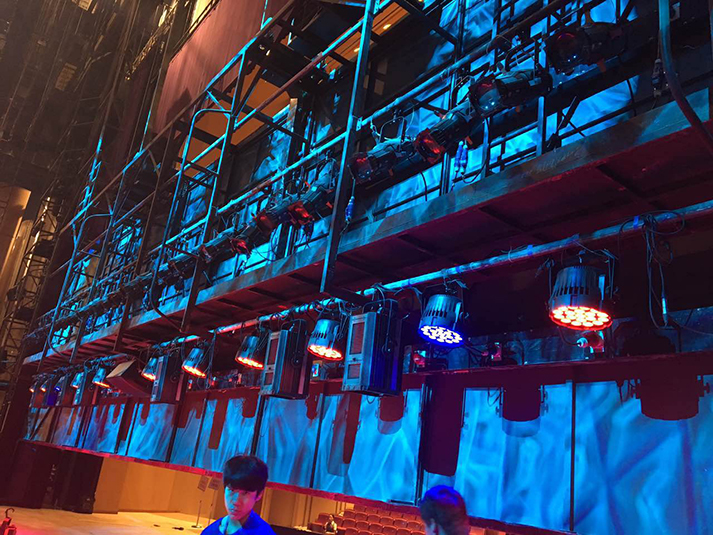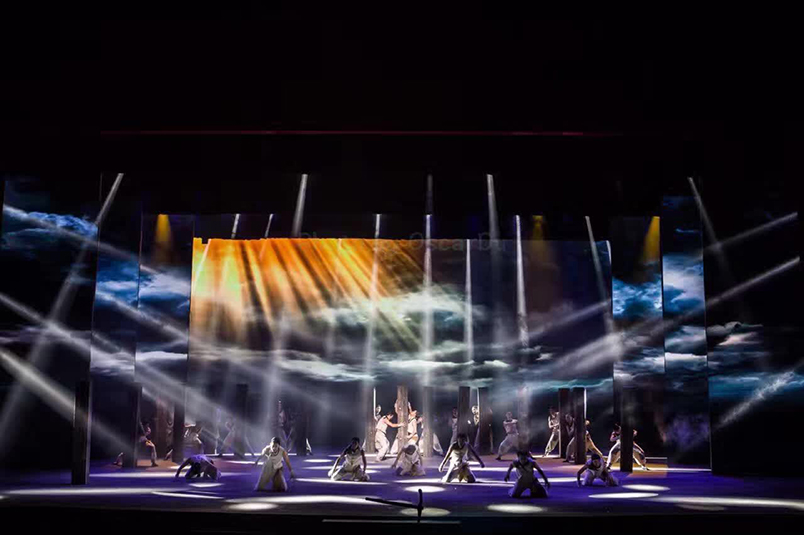 "我從舞臺劇的燈光設計思路出發(fā),用沿幕把所有燈具在舞臺上隱藏起來,使觀眾看不見燈具只看見色彩和光線。這次晚會共采用了80臺1500w圖案燈(特寶麗V2500S)、60臺1500w染色燈、120臺光束燈(特寶麗PT320B)、160臺LED燈、40臺切割燈(特寶麗V3000P)以及4臺追光燈(特寶麗FS300M)。切割燈特寶麗V3000P主要做面光使用,用于把舞臺多余的光切掉,使舞臺更干凈更透亮,同時也讓演員和舞美道具等清晰可見。“小鋼炮”浩洋光束燈PT320B主要用于打造炫目的舞臺效果;我在設計中將圖案燈里面的圖案與染色燈的色彩功能充分疊加之后鋪照在舞臺上,這種方式能夠呈現(xiàn)出更加繽紛和絢麗的圖案效果;地流燈和側(cè)光的運用則讓每一位演員都在舞臺上呈現(xiàn)更加立體。