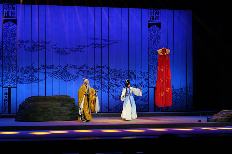 莆仙戲《海神媽祖》主要描述的是林默娘痛心海難無(wú)情而無(wú)私救苦救難,深得上天感動(dòng),最終被授予遇災(zāi)警示及造福于民的法力,從平凡漁家女子到海上女神的傳奇。劇目以敘事詩(shī)般的藝術(shù)手法刻畫(huà)出媽祖娘娘扶危濟(jì)困的偉大形象,靈活展示了媽祖娘娘德、行善、大愛(ài)”的精神。隨著海上貿(mào)易和文化交流的延伸,媽祖信俗從沿海各地傳播到東南亞乃至全世界,媽祖也因此成為了“海上絲綢之路保護(hù)神”。