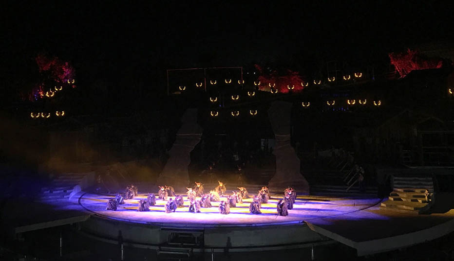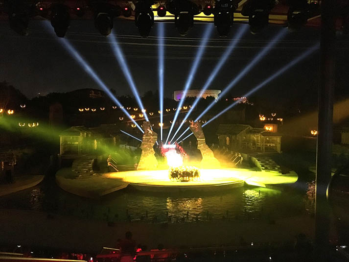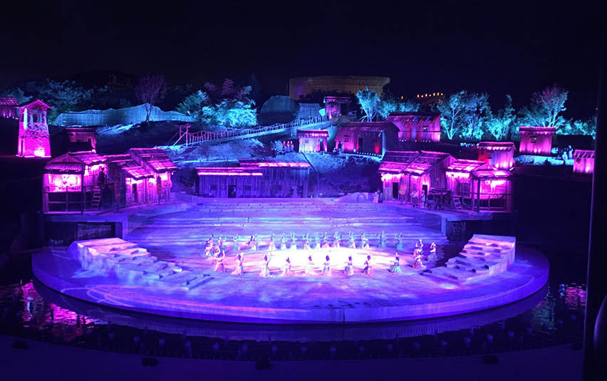 《阿惹妞》作為一部風情實景劇,演出舞臺全部為戶外實景,既有遠山又有流水,場景宏大,因此對舞臺景物布光要求很高,不僅要使景物光線分布均勻且達到足夠的亮度,對燈光的層次性要求也非常高,既要保證遠方山峰的輪廓清晰可見,又要讓觀眾看得清舞臺中區(qū)演員的表演。G12 HYBRID 能夠做到大范圍均勻鋪光,且具有超高光通量,發(fā)光效率高的同時具備遠距離照射的能力,在保證遠景和中景清晰的前提下,運用G12 HYBRID亮度變化,配合現(xiàn)場光焰等特效,能夠制造出極具擴張感的震撼視覺效果。
