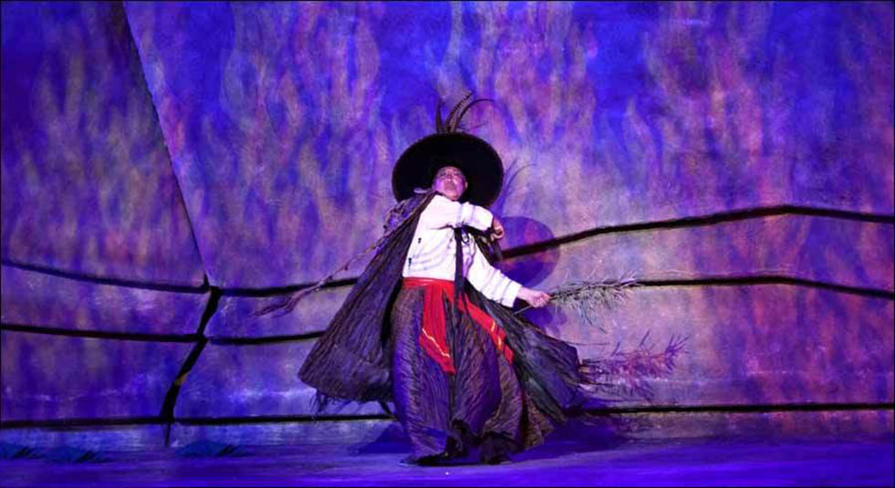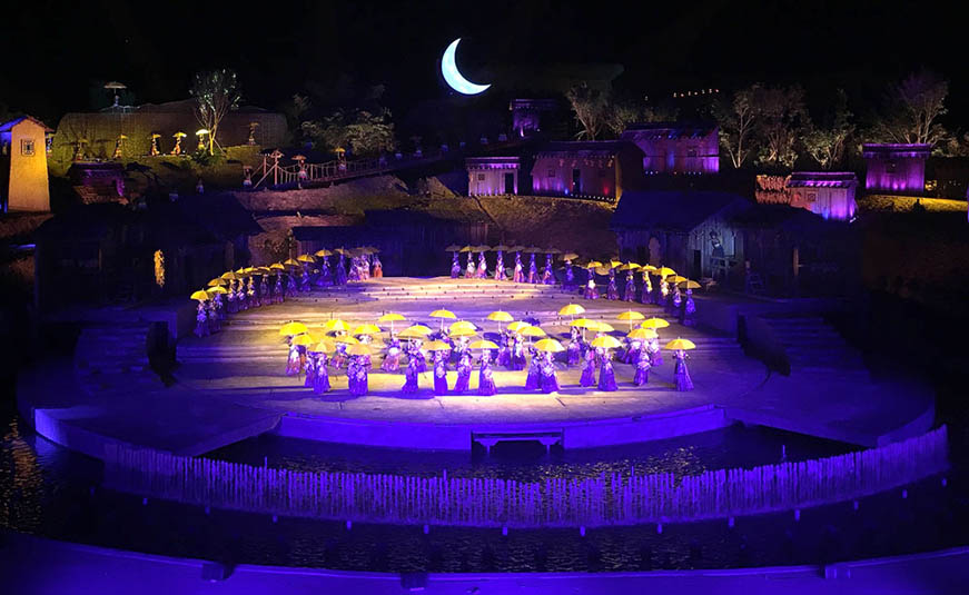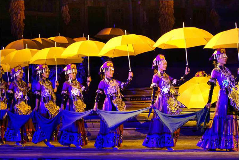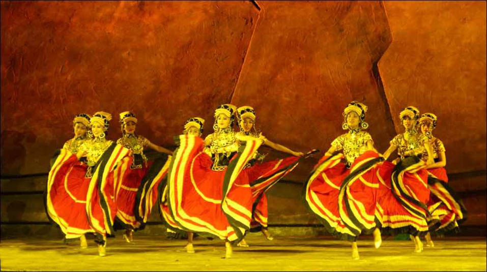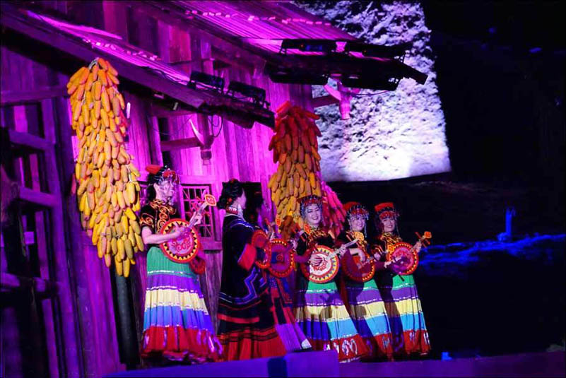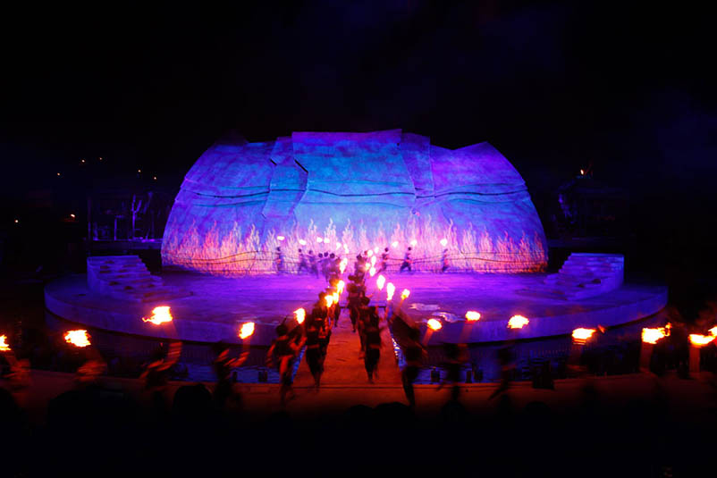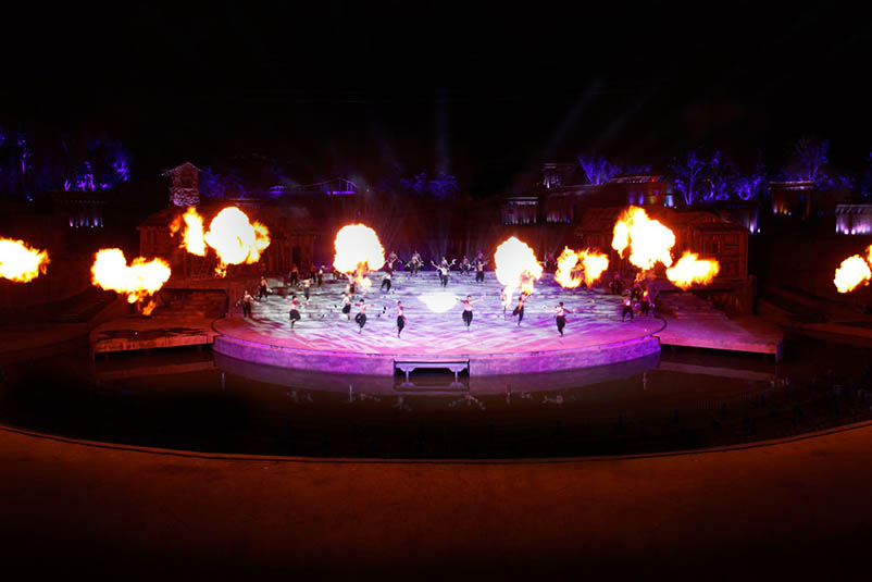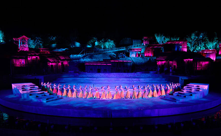 《阿惹妞》是目前中國第一臺火秀實景劇,該劇全長60分鐘,共分為5個篇章,從民族源起的腳步展開,講述了阿惹妞情與愛的生命畫卷。該劇以“火”作為彝族的生命圖騰貫穿始終,呈現(xiàn)了“火”作為一個民族情感的載體而展開的生命傳奇,具有濃厚的彝族文化風情。