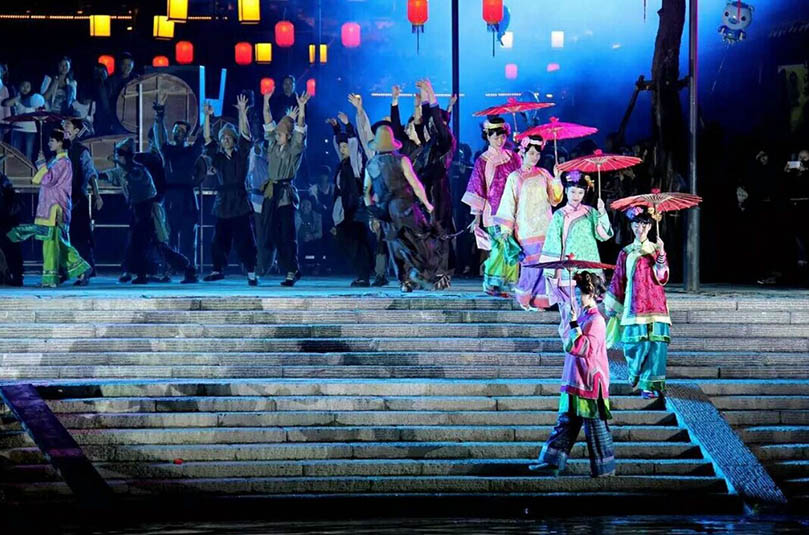 《夢(mèng)回穿紫河》圍繞“河”“船”“人”三個(gè)關(guān)鍵詞,分“紫漁歌”、“依水筑城”、“河街舊事“、“浪漫之旅”四個(gè)篇章,利用大船、燈光、煙花等元素,將常德文化與現(xiàn)代機(jī)械光電技術(shù)結(jié)合,還原包括“古河”、“桃花源”、“沅水號(hào)子”等文化藝術(shù)印象,將觀眾帶入一個(gè)光與影交相輝映、水與人和諧共存的美好境界。乘坐“水上巴士”沿著11公里長(zhǎng)的穿紫河河道游覽,享受常德老河街原景、折子戲、常德絲弦、劉海砍樵音樂(lè)劇等實(shí)景演出,再配合燈光特效等高科技手法,常德本地民俗文化與現(xiàn)代科技的完美結(jié)合,打造出一場(chǎng)古典與現(xiàn)代結(jié)合的唯美大賞。