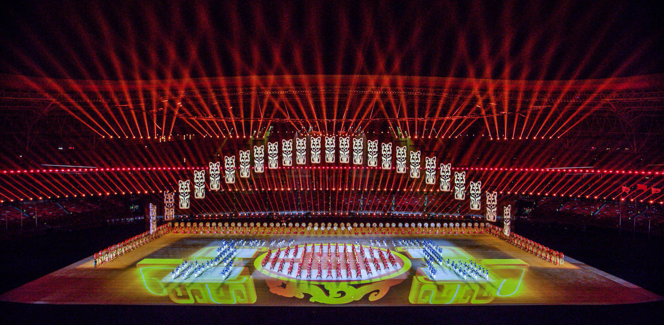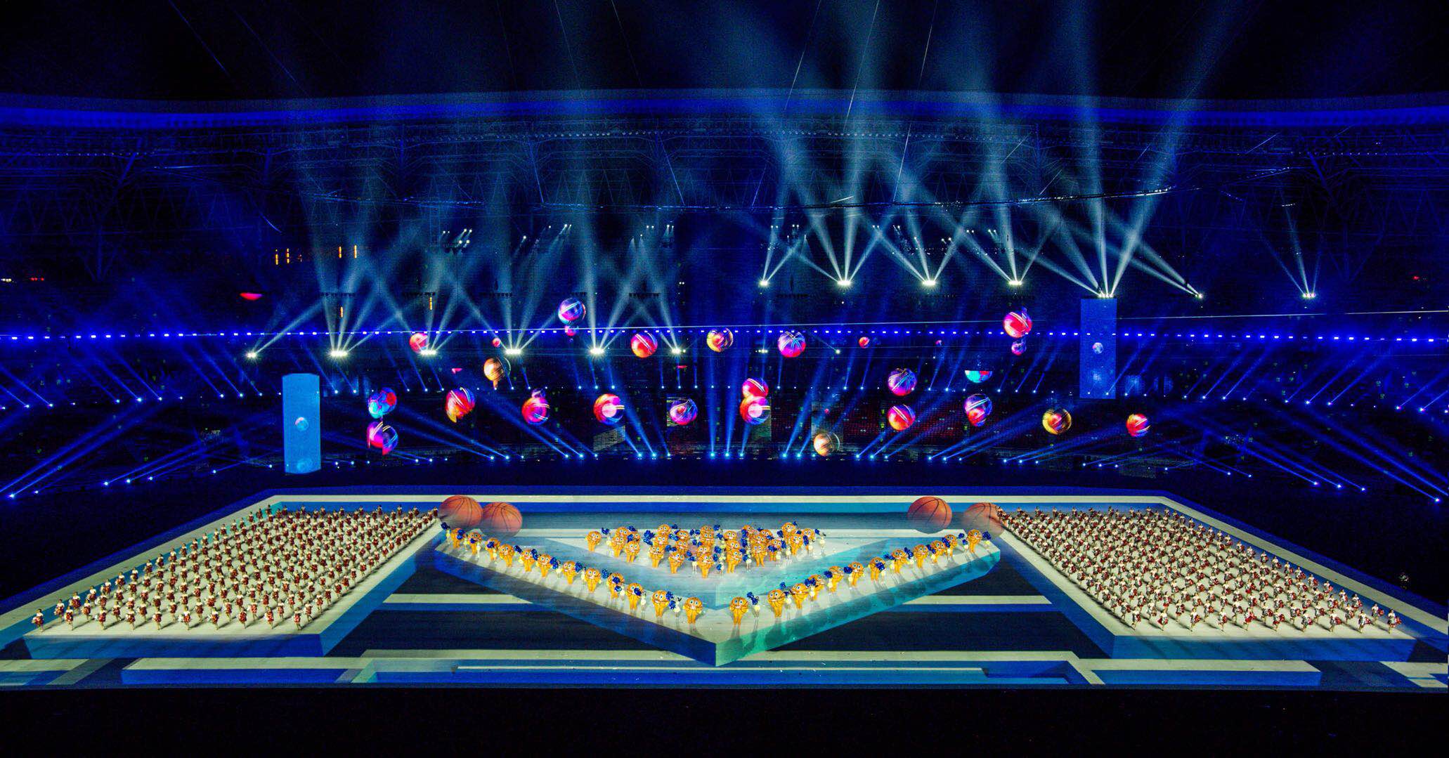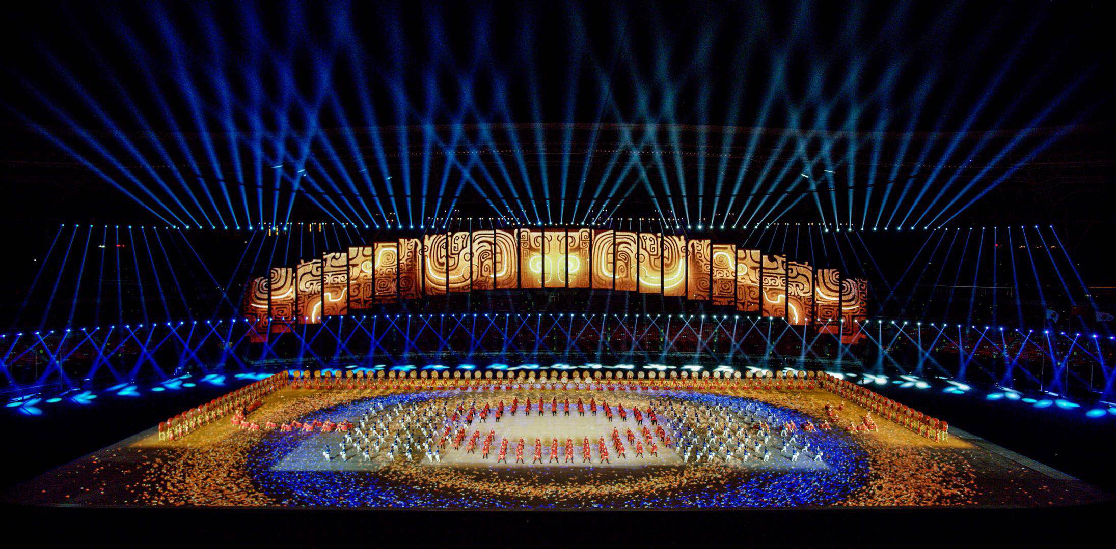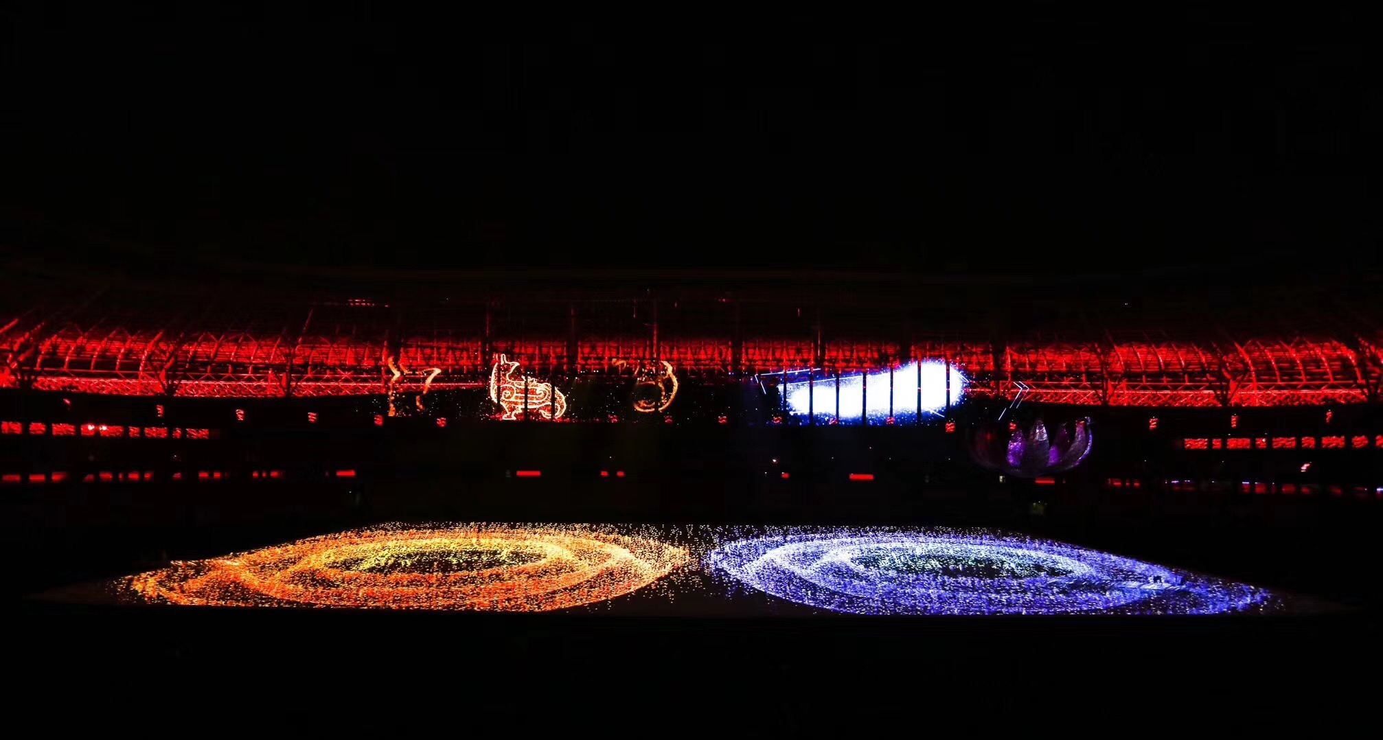 運動會開閉幕式整體設計的核心理念為“奮斗幸福觀”,開幕式的主題為“奮斗新時代“,閉幕式將以“幸福新征程”為主題與之呼應。開幕式演出運用了大型燈光設備、舞臺機械裝置、高清投影設備、懸掛表演裝置、先進音響設備、空中飛行設備等多種技術手段,形成地面、舞臺、空中三維藝術呈現(xiàn)形式,將中國傳統(tǒng)文化與國際先進科技進行完美結合,形成一臺國際化高水準的全景化演出。