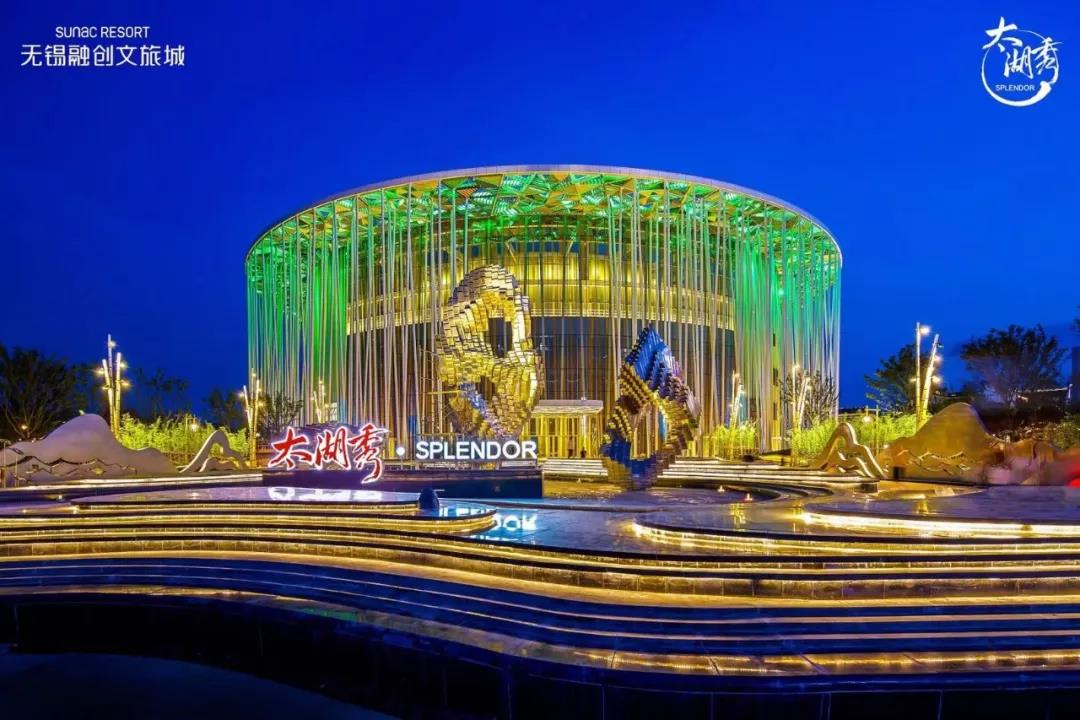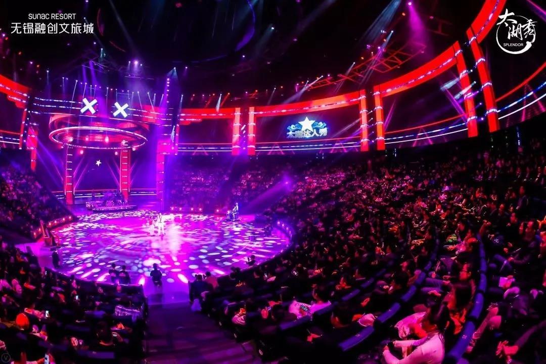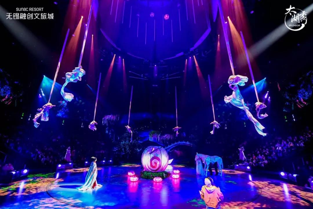 太湖秀劇場的創(chuàng)作靈感來自于江南特色的“竹林”,外圍是365根層疊錯落的仿竹鋼立柱,屋頂使用不規(guī)則的三角形金屬百葉板進行裝飾。3萬平米的劇場內(nèi),直徑16米的主舞臺可實現(xiàn)360°旋轉(zhuǎn)、2米升降和10°傾斜,空中1800㎡的360°環(huán)形LED大屏嚴(yán)絲合縫,配合11臺高速布景吊機、22個高速雜技卷揚機、500多個高空舞美吊點打造沉浸式的視覺盛宴,此外還有先進的高空3D噴泉和舞臺水處理系統(tǒng),可以實現(xiàn)干舞臺和水舞臺的快速切換。