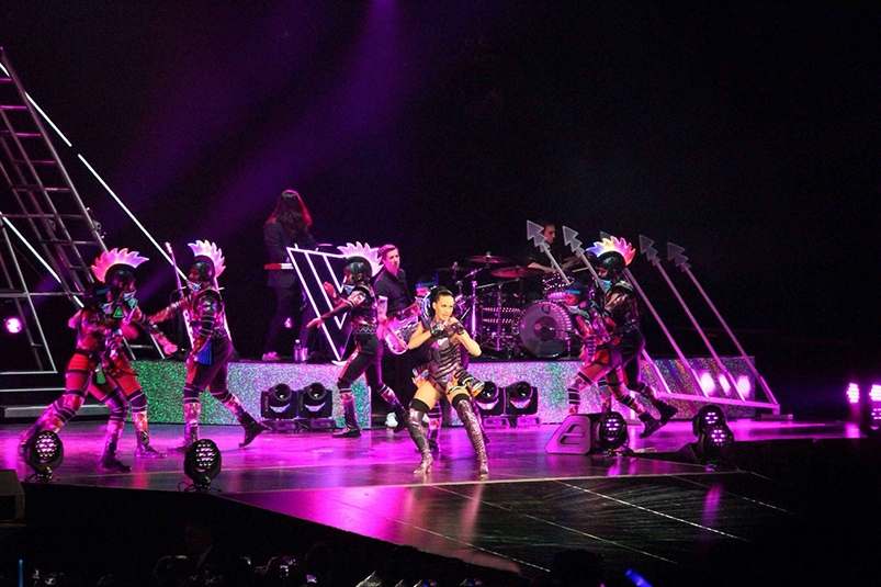 Katy Perry以開(kāi)場(chǎng)曲《Roar》拉開(kāi)序幕,之后《E.T》、《California Gurls》(加州女孩)、《TeenageDream》(花漾年華)、《Wide Awake》(如夢(mèng)初醒)等金曲一首不落,引發(fā)粉絲的尖叫聲和喝彩此起彼伏。配合演唱會(huì)主題,水果姐造型百變服飾斑斕,她時(shí)而變身俏麗貓女在《Hot N Cold》(忽冷忽熱)的音樂(lè)中與舞伴嬉戲,時(shí)而以埃及艷后的高貴之姿騎優(yōu)雅坐上《DarkHourse》(黑馬),一轉(zhuǎn)眼又身穿向日葵長(zhǎng)裙化身女神抱著吉他動(dòng)情演繹《The One That Got Away》(離開(kāi)的人是你),讓人看得眼花繚亂。