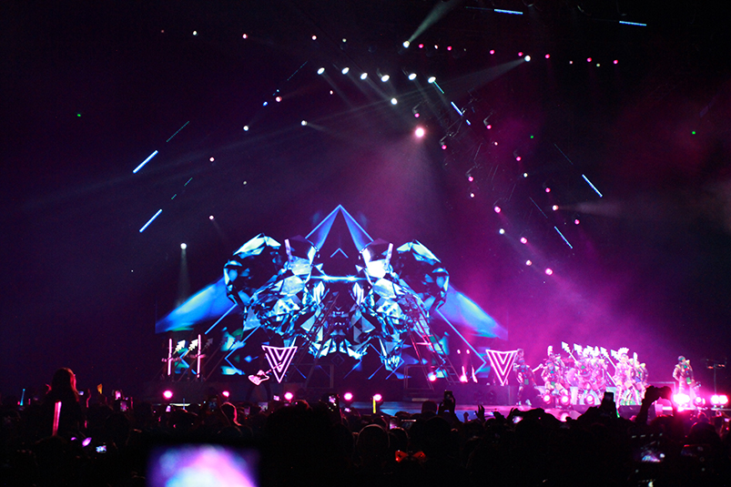 當(dāng)晚,在特別嘉賓DJ雙人組The Dolls長(zhǎng)達(dá)近半小時(shí)的熱場(chǎng)后,Katy Perry身著一襲紫色熒光虎面緊身超短于晚上21時(shí)閃亮登場(chǎng)。水果姐在近90分鐘的時(shí)間里,以百變?cè)煨秃蛣鸥锜嵛?,high翻全場(chǎng),浩洋電子燈具交相輝映,完美融入音樂(lè)旋律中,讓臺(tái)下粉絲徹底沸騰!
