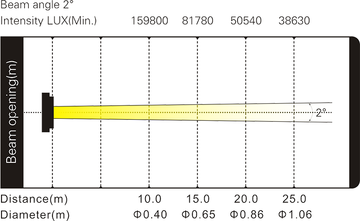 光斑角度:2°,獨(dú)特的光路結(jié)構(gòu)使光束效果更強(qiáng)更亮