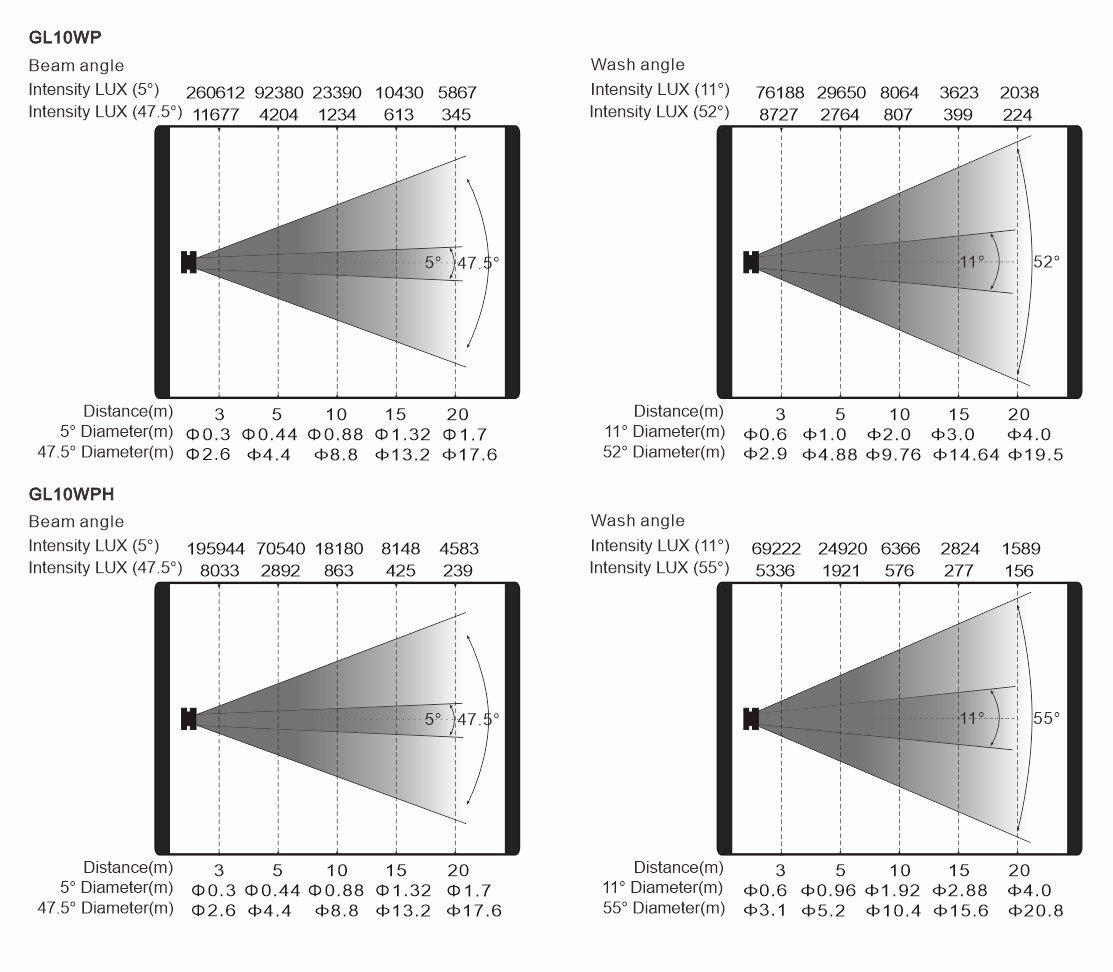 變焦范圍:光束模式:5°- 47.5°(GL10WP/GL10WPH),染色模式:11°-52°(GL10WP),11°-55°(GL10WPH)