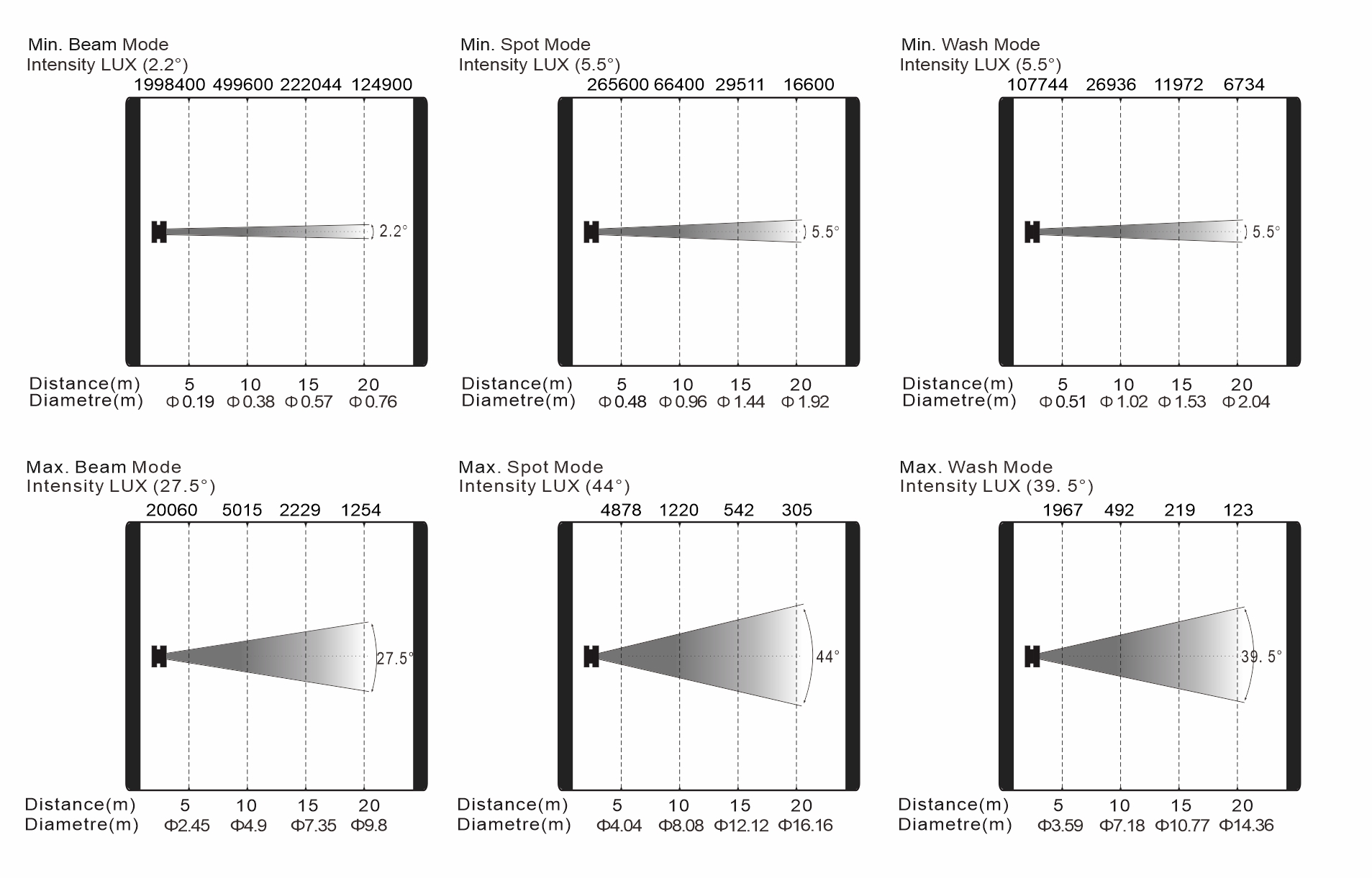 變焦范圍:光束模式: 2.2°- 27.5°,圖案模式: 5.5°- 44°,染色模式: 5.5°-39.5°