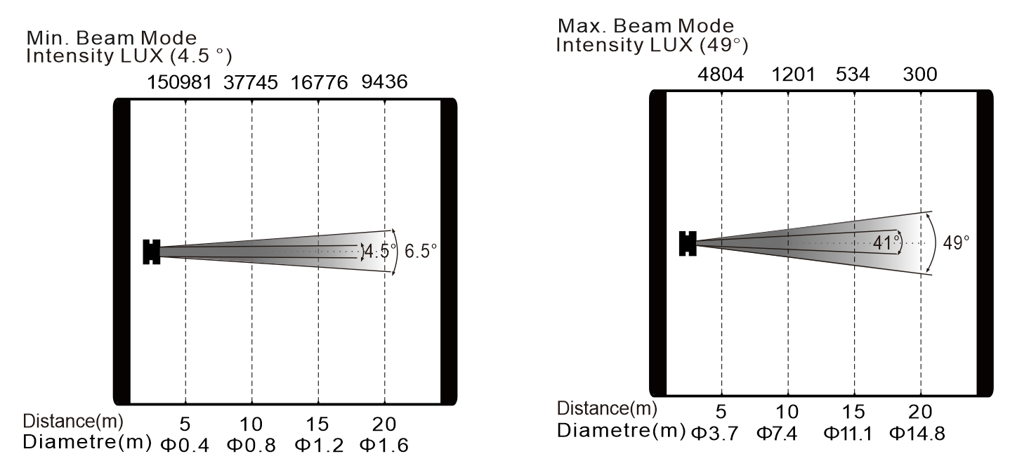 變焦范圍:光束角:4.5°-41°,光斑角:6.5°-49°