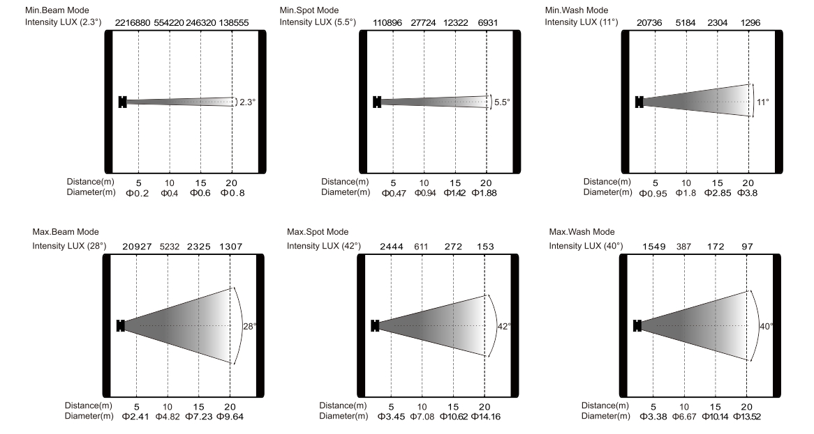 變焦范圍:光束模式:2.3°-28°;圖案模式:5.5°-42°;染色模式:11°-40°