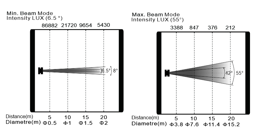 變焦范圍:光束角:6.5°-42°,光斑角:8°-55°