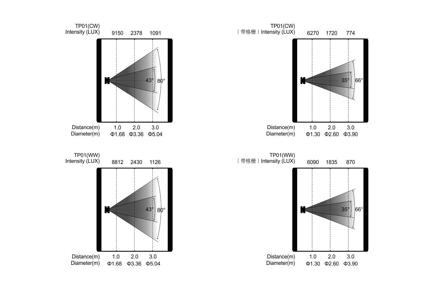 變焦范圍:光束角度:43°(可選格柵 35°),光斑角度:80°(可選格柵 66°)